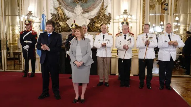 El presidente Javier Milei presidió este lunes la ceremonia de ascenso de efectivos de las Fuerzas de Seguridad nacionales, un acto que marcó además la última actividad oficial de la ministra de Seguridad, Patricia Bullrich, antes de asumir su banca como senadora.