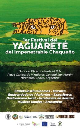 Este sábado 29 de noviembre, desde las 18, se realizará en la plaza central de Miraflores el Primer Festival del Yaguareté del Impenetrable Chaqueño, en conmemoración del Día Internacional del Yaguareté. La actividad busca destacar la importancia de esta especie, declarada Monumento Natural en la provincia, y reforzar su valor ambiental y cultural dentro del Impenetrable.
