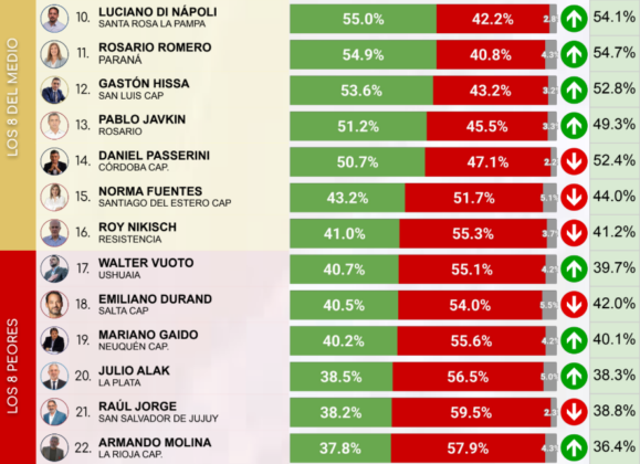 Los intendentes peor calificados del mes de julio de 2025 son: en último lugar, Pablo Grasso (Río Gallegos) con un 37,1% de imagen positiva, seguido por Walter Cortés (Bariloche) con 37,3%, y luego Armando Molina (La Rioja Capital) con 37,8% de aprobación.