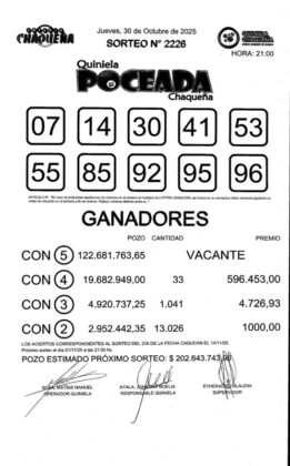 El sorteo del jueves 30 de octubre de La Poceada Chaqueña quedó nuevamente sin ganador del premio mayor, lo que hizo que el pozo alcanzara la cifra récord de $202 millones para el primer sorteo de noviembre. Ningún apostador logró acertar los cinco números requeridos: 07, 14, 30, 41, 53, 55, 85, 92, 95 y 96.