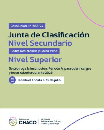 El Ministerio de Educación de la Provincia, a través de las juntas de Clasificación de Nivel Secundario -sedes Resistencia y Sáenz Peña, escuelas secundarias comunes y técnicas- y Junta de Clasificación de Nivel Superior comunica que se prorroga el periodo de inscripción, Periodo A, para cubrir cargos y horas cátedra durante el año 2025 en escuelas secundarias y técnicas e instituciones de nivel superior. Dicha prórroga se extiende desde el 1 y hasta el 12 de julio.