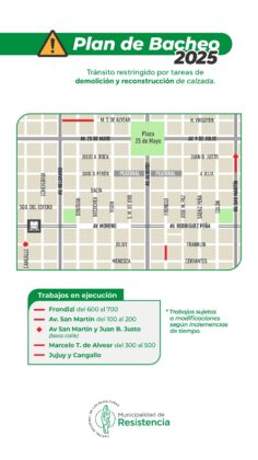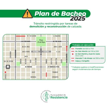 La Municipalidad de Resistencia y la Dirección de Vialidad Provincial, llevan adelante un plan de bacheo en la ciudad, y en ese sentido, informaron los sectores donde esta semana continuarán las obras y por consiguiente, estará restringida la circulación.