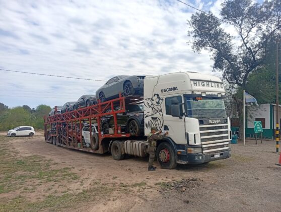Efectivos pertenecientes al Grupo Vial “Ingeniero Juárez” dependientes del Escuadrón 19, desplegados en un control sobre la Ruta Nacional N° 81, Kilometro 1.626 a la altura del Paraje Simbolar, en Formosa, detuvieron la marcha de un transporte de cargas internacional de bandera paraguaya, que transportaba vehículos de alta gama y dos motos de altas cilindradas.