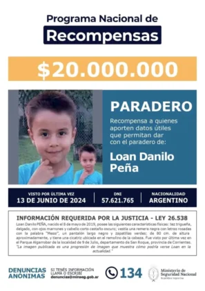 El Ministerio de Seguridad de la Nación actualizó la búsqueda de Loan Danilo Peña, el niño correntino desaparecido en junio de 2024, y difundió una nueva imagen con progresión de edad para mostrar cómo podría verse actualmente.