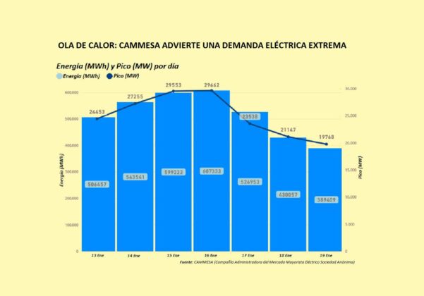 El informe de CAMMESA, que es la Compañía Administradora del Mercado Mayorista Eléctrico, pronostica que ya durante la semana del 13 al 19 podrían darse picos cercanos a los 30.000 MW (megavatios o megawatt) de demanda energética nacional, con lo cual se daría un nuevo récord histórico.
