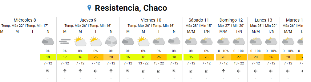 El domingo 12 el ascenso se hará notar en la temperatura mínima, que subirá hasta los 20°C, mientras que la máxima se estabilizará en los 27°C. La probabilidad de lluvias se mantiene en un nulo 0% hasta el inicio de la próxima semana.