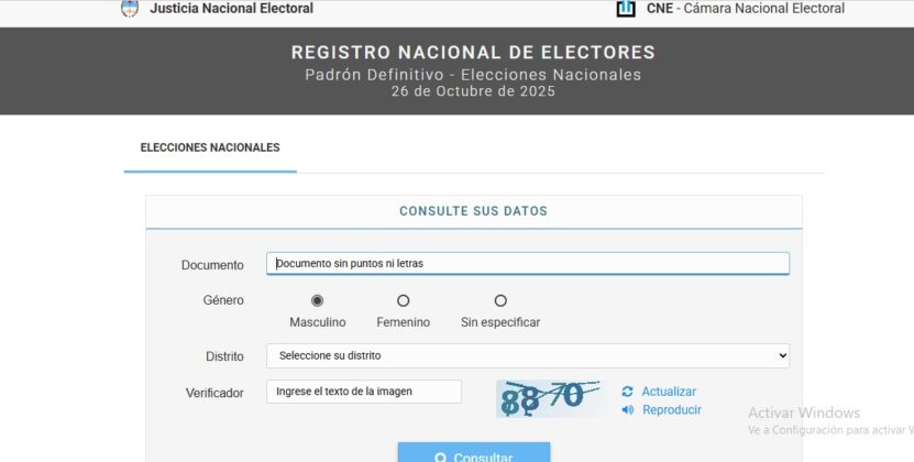 Con el padrón electoral definitivo ya habilitado, los ciudadanos pueden consultar su lugar de votación ingresando a la web oficial. Para realizar la búsqueda, es necesario cargar el número de DNI, género, distrito y completar el casillero verificador.