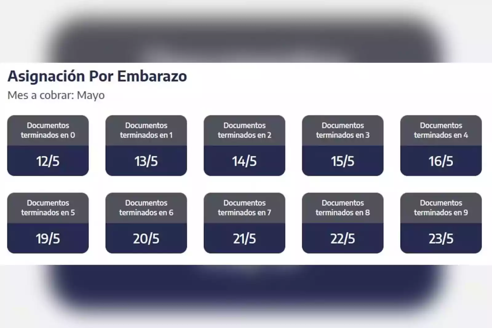 Calendario de pago de la Asignación por Embarazo para el mes de mayo, con fechas asignadas según la terminación del número de documento.