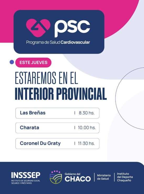 En esta oportunidad, el equipo del programa estará en las sedes de los municipios de las ciudades de Las Breñas, Charata y Coronel Du Graty, con el objetivo de fortalecer la detección temprana de factores de riesgo y promover hábitos saludables que contribuyan a la prevención de enfermedades cardiovasculares.
