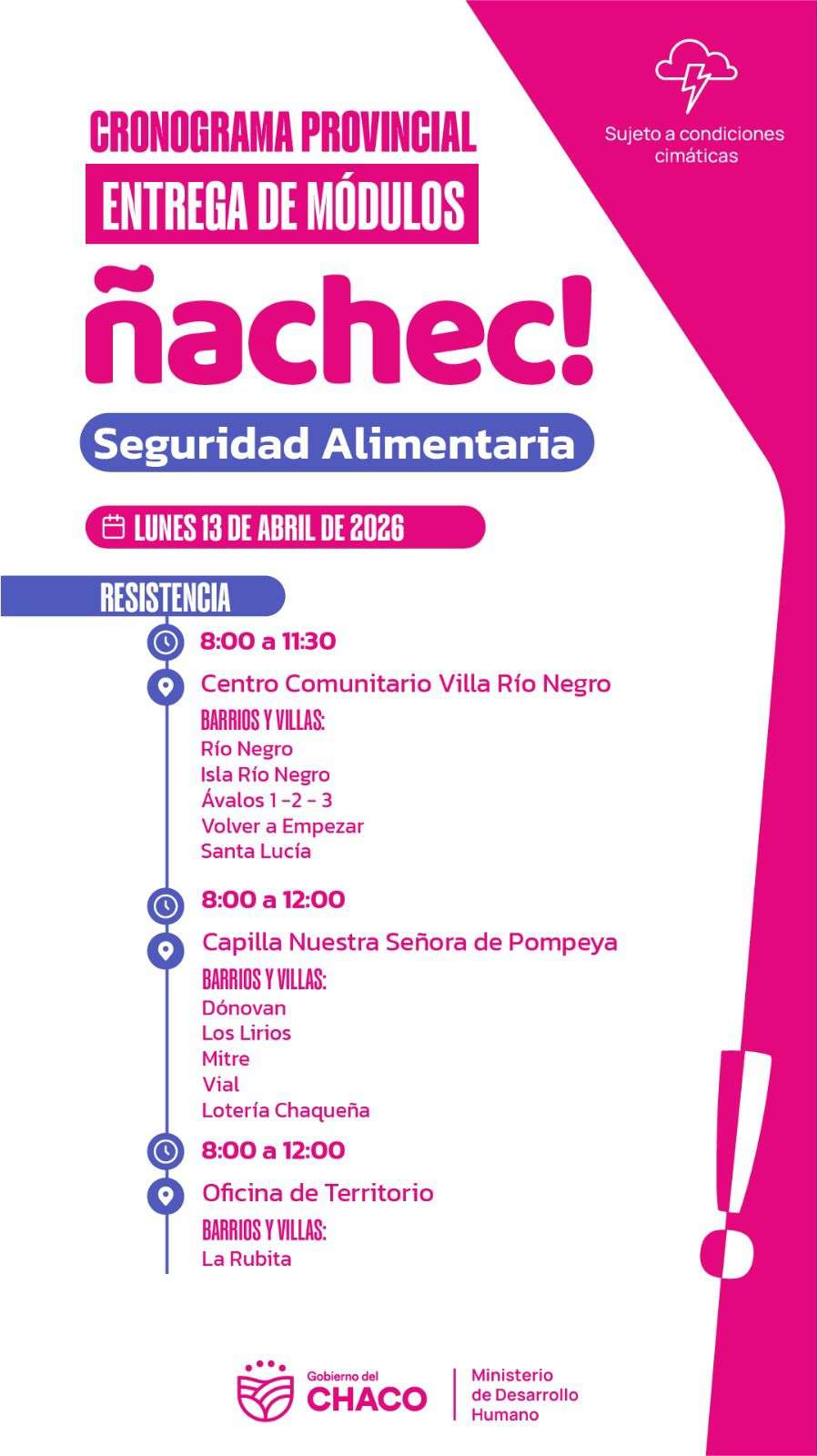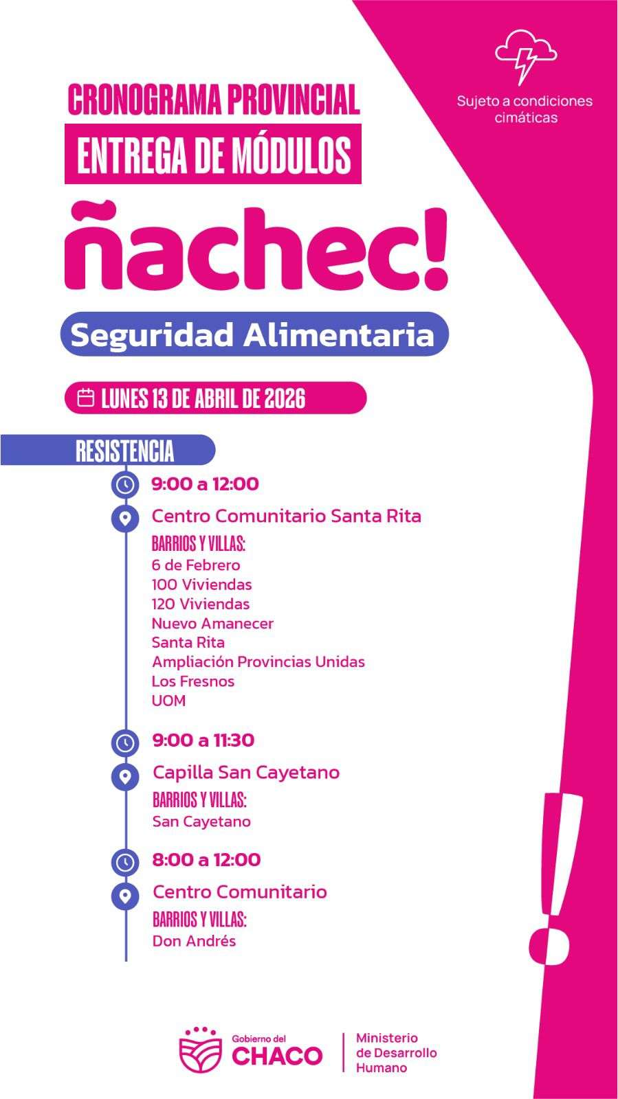 El Gobierno provincial, a través del programa Ñachec y en el marco de las políticas de Seguridad Alimentaria, llevará adelante este lunes 13 de abril una nueva jornada de entrega de módulos alimentarios en distintos puntos de la ciudad de Resistencia.