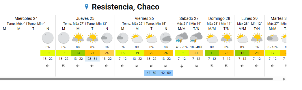 El tiempo continuará con condiciones estables en Resistencia y alrededores durante los próximos días, con ascenso gradual de la temperatura y cielos mayormente despejados. Sin embargo, hacia el sábado se espera un cambio en las condiciones climáticas, con la posible llegada de tormentas aisladas y chaparrones, según informó el Servicio Meteorológico Nacional (SMN).