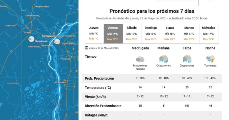 Para el sábado se prevén tormentas, con vientos leves del noreste rotando al este, con un piso térmico de 19 grados y un techo de 25. El domingo, también tiene pronóstico de lluvias y tormentas aisladas, con 18 grados de temperatura mínima y 23 de máxima.