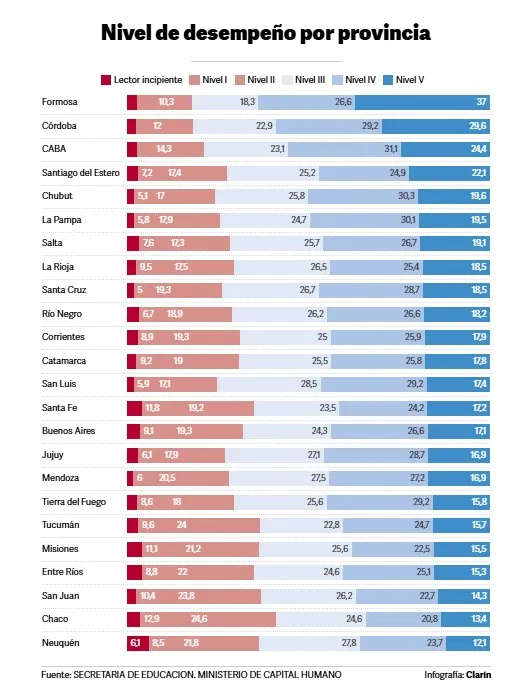 En el ranking provincial, Formosa se ubica en primer lugar, con un 63,6% de estudiantes que alcanzan o superan los objetivos de lectura. En contraste, Chaco se encuentra entre las provincias con los peores resultados, junto a San Juan y Neuquén. En la región de Chaco, solo el 34,2% de los alumnos de tercer grado alcanza el nivel esperado en lectura.