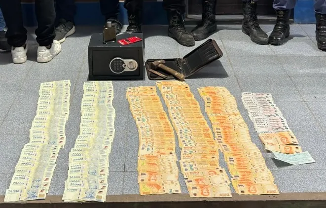 El acusado salió voluntariamente del domicilio y entregó una caja fuerte dañada, un martillo y un corta fierro, herramientas presuntamente utilizadas para abrirla, además de un perfume robado y un total de $4.189.000 en efectivo, distribuidos en billetes de distintas denominaciones.