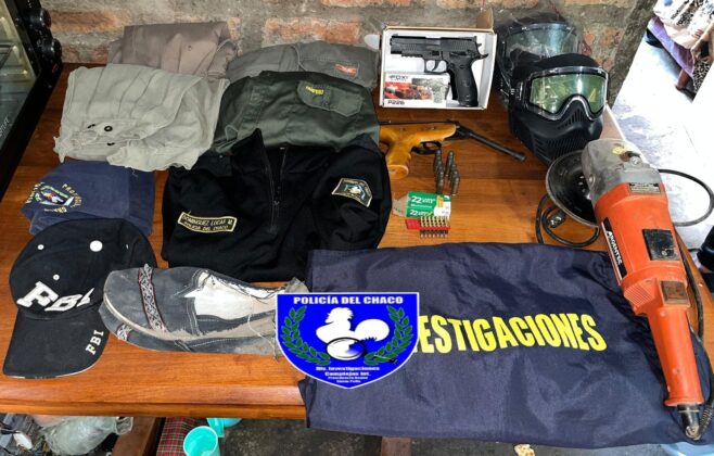 Un pistolón calibre 22, una réplica de pistola a gas, municiones, ropa con identificación policial, dos bicicletas, un televisor de 50 pulgadas, un compresor y otros objetos electrónicos y herramientas, muchos de los cuales se presume podrían haber sido utilizados en distintos ilícitos.