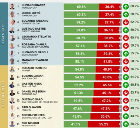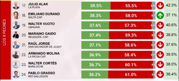 En contraste, Pablo Grasso (Río Gallegos) encabeza el segmento de los intendentes con peor imagen, con solo 36,2% de aprobación y más del 61% de rechazo.