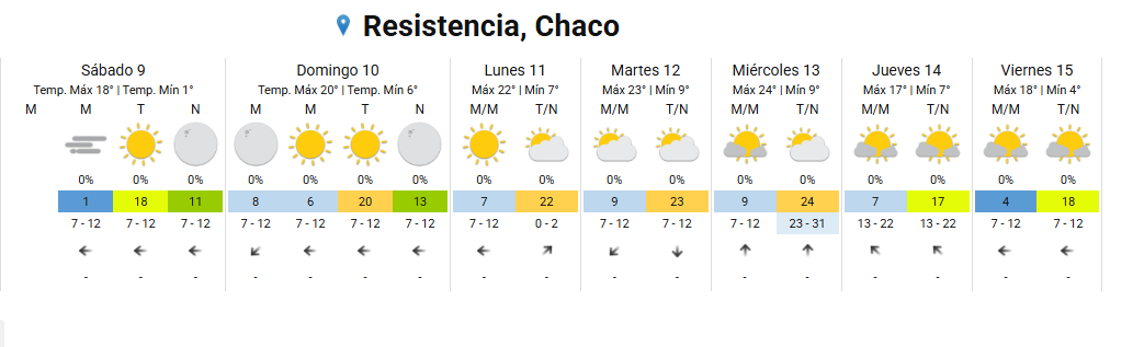 La ciudad de Resistencia vivirá una jornada típicamente invernal este sábado. Amaneció con una temperatura de 1 grado. Con cielo despejado y sin probabilidades de lluvias, según el pronóstico del Servicio Meteorológico Nacional, el techo será de 18 grados, con buena visibilidad durante toda la jornada.
