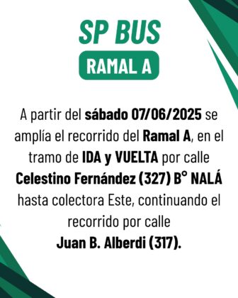 En lo que refiere a la ampliación de ramales, el Ramal A realizará el tramo de IDA y VUELTA por calle Celestino Fernández (327) del barrio NALÁ hasta colectora Este, continuando el recorrido por calle Juan B. Alberdi (317).