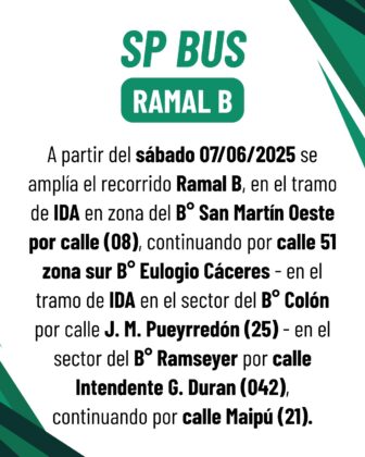 La Municipalidad de Sáenz Peña, informó que a partir de este sábado 7 de junio, los ramales A,B y C amplían sus recorridos y el servicio de Transporte Urbano de Pasajeros modificará sus horarios de lunes a sábado. En tanto que los domingos y feriados no habrá servicio de transporte urbano.