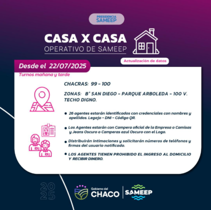 Desde este lunes 22 de julio, la empresa estatal SAMEEP lleva adelante un operativo territorial “Casa x Casa”, con el objetivo de actualizar datos de los usuarios.