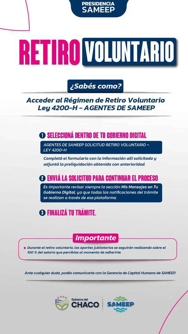 La empresa estatal Sameep anunció su adhesión al Régimen de Retiro Voluntario Móvil, en el marco de lo establecido por la Ley N° 4200-H y su decreto reglamentario, impulsados por el Gobierno provincial.