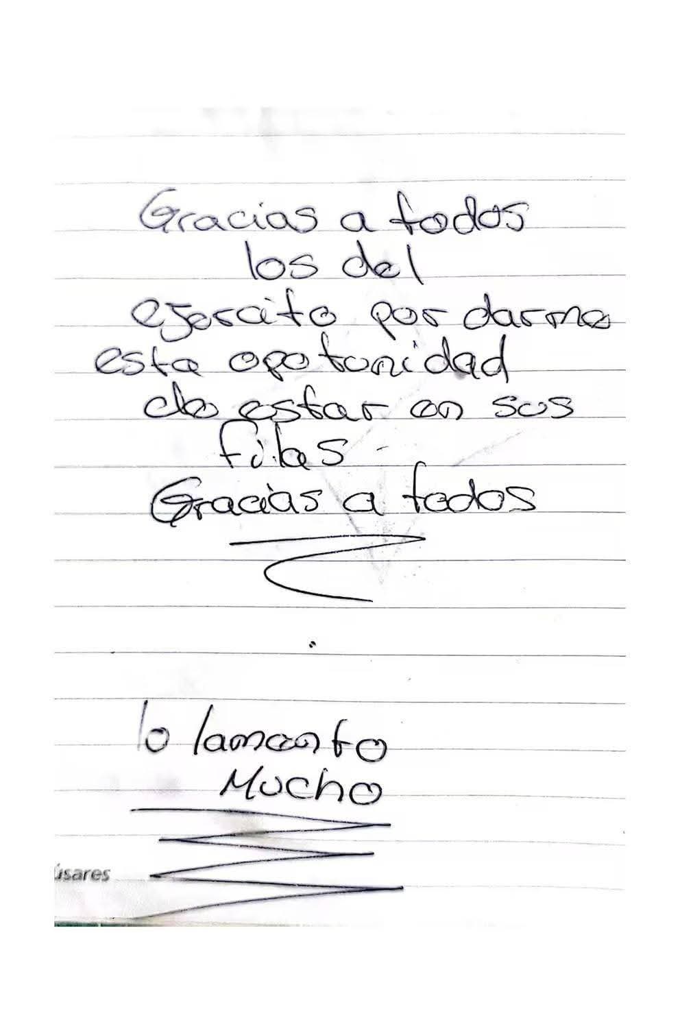 El joven también agradeció a la fuerza: “Gracias a todos los del Ejército por darme esta oportunidad de estar en sus filas. Gracias a todos. Lo lamento mucho”.