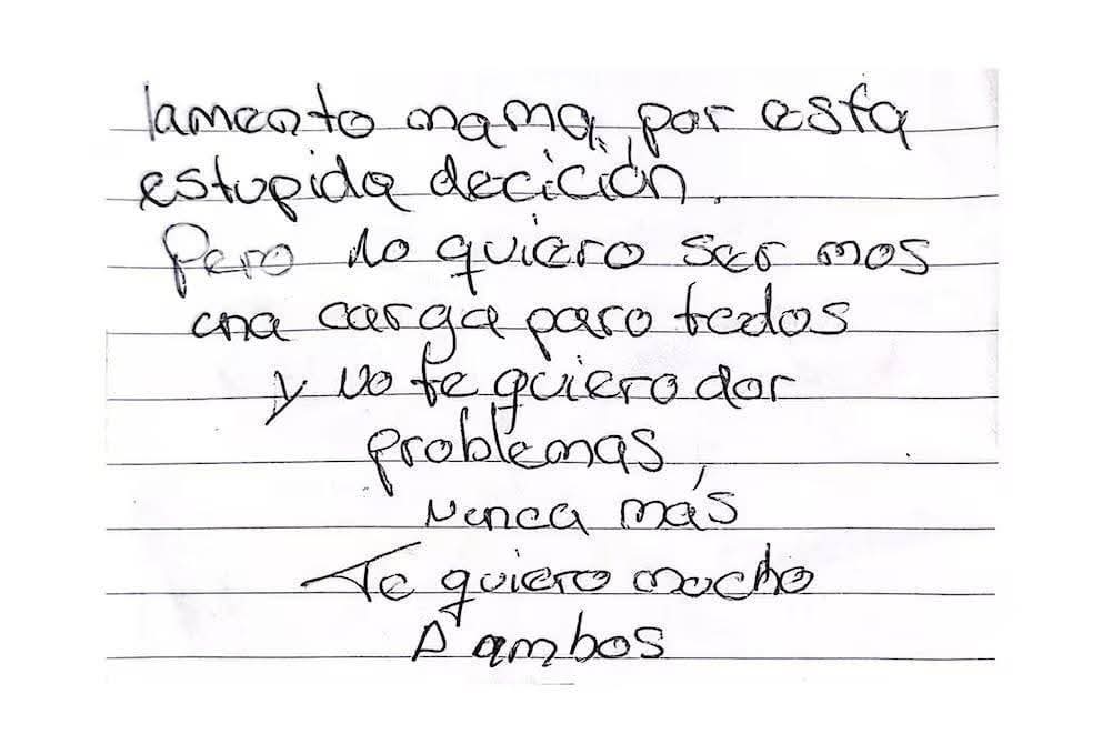 En el inicio del mensaje expresó: “Lamento, mamá, por esta estúpida decisión. Pero no quiero ser más una carga para todos y no te quiero dar problemas nunca más. Te quiero mucho. A ambos”.