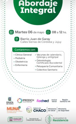 Mañana se llevará a cabo un operativo de Abordaje Integral en el barrio Juan de Garay de la ciudad de Resistencia. La actividad tendrá lugar entre las 08:00 y las 12:00 hs en las calles Sierras de Córdoba y Jujuy, ofreciendo una amplia variedad de servicios gratuitos a la comunidad.