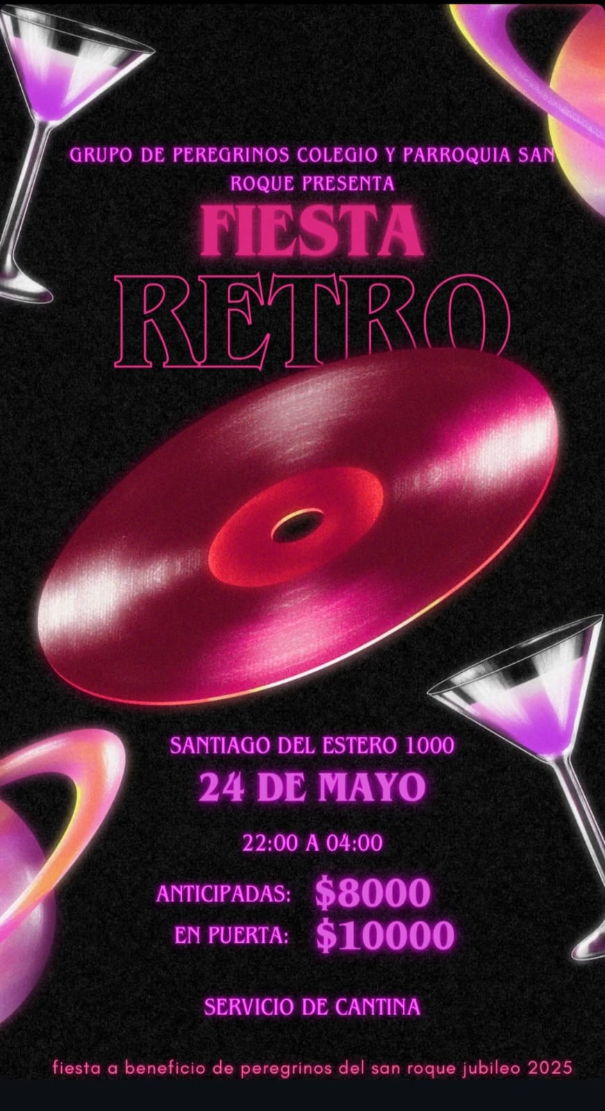 En este sentido y como una acción benéfica organizan para el sábado 24 de mayo próximo, una fiesta Retro, que iniciará a las 22 horas y se realizará en el tinglado de la parroquia San Roque, ubicada en Santiago del Estero al 1000. Contará con servicio de cantina y ya están disponibles los precintos que son las entradas anticipadas, que tienen un costo bonificado y pueden adquirirse los días hábiles en el Colegio de 7.30 a 19 hs.