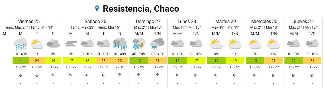 Para este viernes en Resistencia y zonas aledañas, se espera una jornada con cielo mayormente cubierto. La temperatura mínima se ubicará en torno a los 14°C, mientras que la máxima alcanzará los 24°C. Durante la mañana podrían registrarse lloviznas aisladas, en tanto que por la tarde y la noche el cielo permanecerá mayormente nublado.