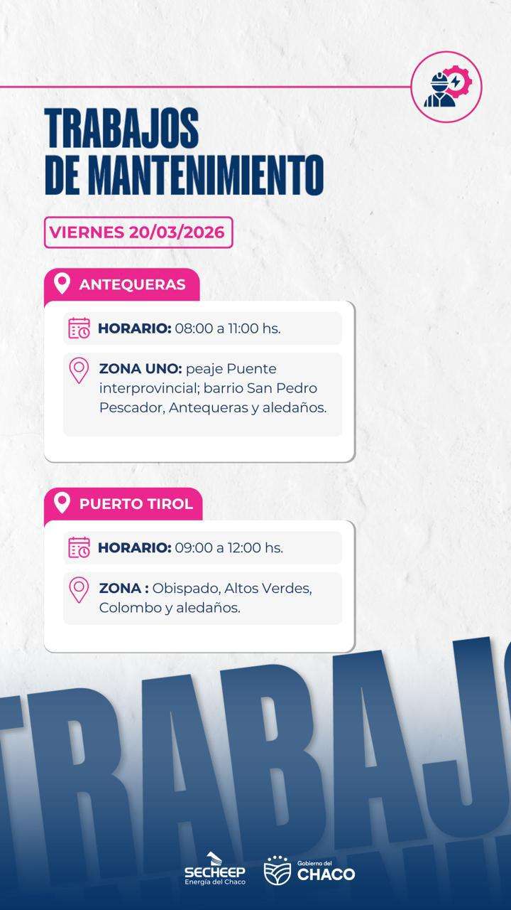 La empresa energética SECHEEP (Servicio Energético del Chaco; Empresa del Estado Provincial) comunicó que, durante la jornada de este viernes 20 de marzo de 2026, se llevarán a cabo trabajos de mantenimiento en la red eléctrica.