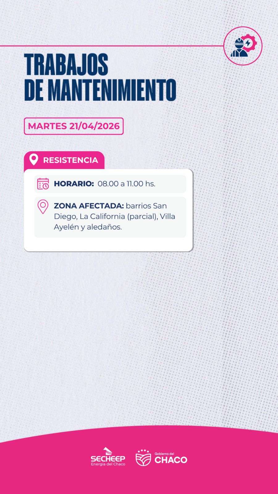 La empresa provincial de energía, SECHEEP, informó que durante la jornada de este martes 21 de abril, se llevarán a cabo tareas de mantenimiento en la red eléctrica de la capital provincial.