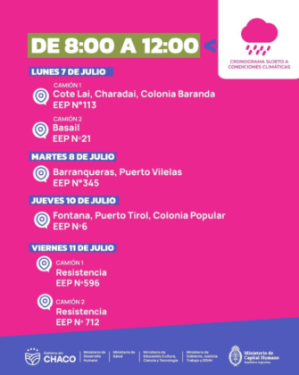 Lunes 7 de julio: Camión 1: Cotelai, Charadai, Colonia Baranda. EEP Nº113. Camión 2: Basail. EEP Nº21.