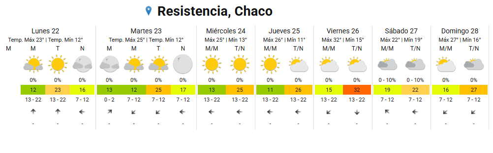 Para el martes se esperan condiciones similares: mínima de 12°C, máxima de 25°C y cielo algo nublado durante el día, despejándose hacia la noche.