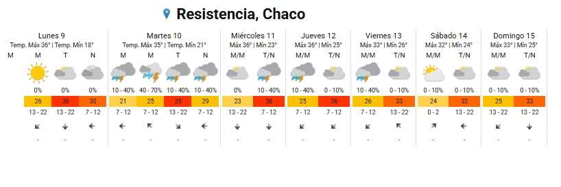 La ciudad de Resistencia se prepara para una semana marcada por altas temperaturas y una marcada inestabilidad atmosférica. Según los datos del pronóstico extendido, los vecinos deberán convivir con máximas que rozarán los 36°C y la probabilidad de tormentas aisladas que se intensificarán hacia el martes.