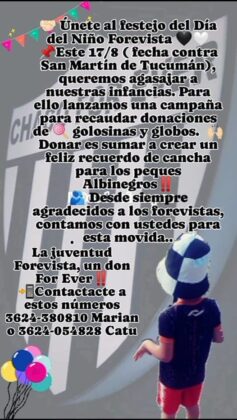 Este 17/8 ( fecha contra San Martín de Tucumán), queremos agasajar a nuestras infancias. Para ello lanzamos una campaña para recaudar donaciones de golosinas y globos. Donar es sumar a crear un feliz recuerdo de cancha para los peques Albinegros‼️