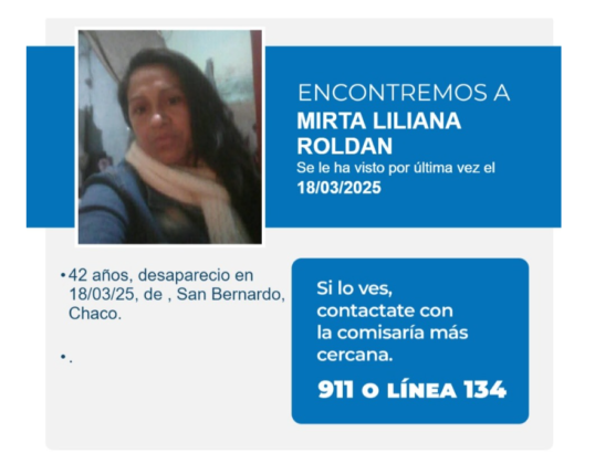 La Policía del Chaco en base a una denuncia registrada en Comisaria San Bernardo, solicita a la comunidad su colaboración para dar con el paradero de MIRTA LILIANA ROLDAN.