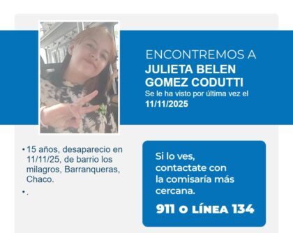 La Policía del Chaco solicita la colaboración de toda la comunidad para dar con el paradero de la menor Julieta Belén Gómez Codutti, de 15 años, quien fue vista por última vez el pasado 11 de noviembre en el barrio Los Milagros, de Barranqueras.