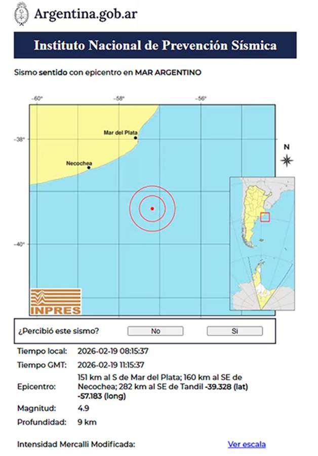 Un sismo de magnitud 4.9 se registró este jueves a las 8.15 con epicentro en el Mar Argentino, a 151 kilómetros al sur de Mar del Plata, según informó el Instituto Nacional de Prevención Sísmica (INPRES).