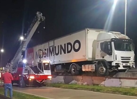 El «equipo» (camión y semirremolque) de la firma Musimundo tuvo que ser removido del lugar por una grúa ya que por su porte y la posición en la que quedó de otra forma habría sido imposible.