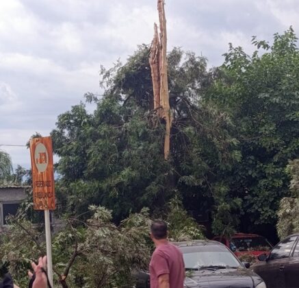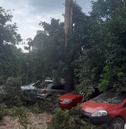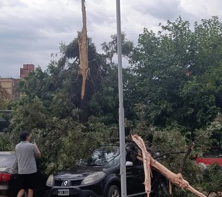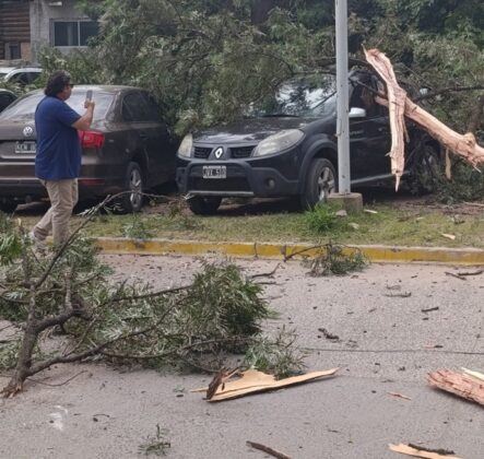 La descarga eléctrica también ocasionó la caída de un árbol de gran tamaño dentro del predio del hospital, que terminó desplomándose sobre varios vehículos estacionados.