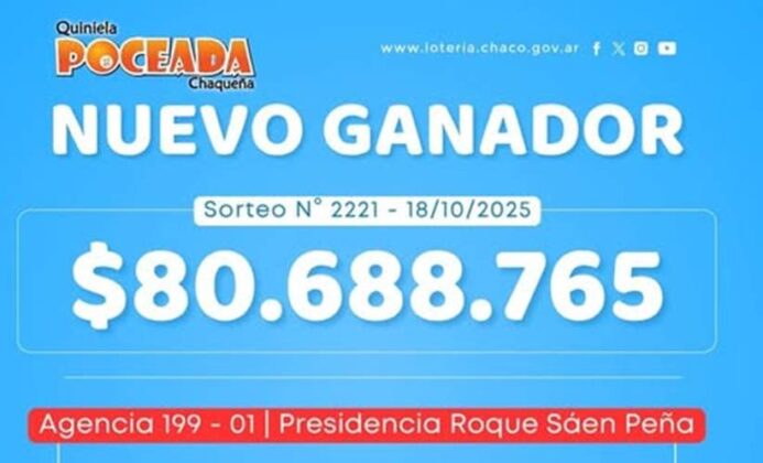 Los números sorteados fueron 00-19-27-28-46-65-78-80-85 y 98, y la combinación ganadora —19, 27, 46, 65 y 78— fue jugada en la Agencia 199 de Presidencia Roque Sáenz Peña. El afortunado apostador se llevará un premio de 80 millones de pesos.