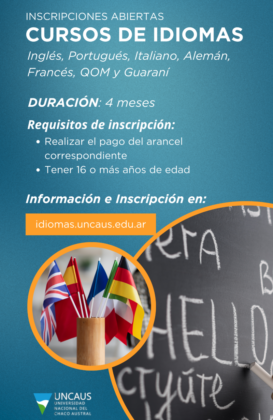 La Universidad Nacional del Chaco Austral, a través de su Escuela de Lenguas, abrió inscripciones para cursos de los siguientes idiomas: inglés, portugués, italiano, alemán, francés, guaraní, en diversos niveles y destaca al idioma qom entre ellos. Las inscripciones estarán abiertas hasta el 14 de marzo de 2025, a través de la página web: idiomas.uncaus.edu.ar