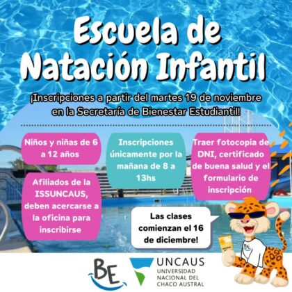 La Universidad Nacional del Chaco Austral (UNCAUS) abrió inscripciones para la Escuela de Natación Infantil, destinada a niños y niñas de 6 años a 12 años. La misma comenzará sus actividades el día lunes 16 de diciembre, en el natatorio universitario, los días lunes, miércoles y viernes, de 9 horas a 12 horas.