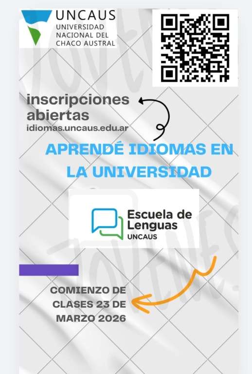 La Universidad Nacional del Chaco Austral (UNCAUS) informó que se encuentran abiertas las inscripciones para una nueva edición de los cursos de idiomas que dicta la Escuela de Lenguas UNCAUS, una propuesta académica orientada a fortalecer la formación cultural, educativa y profesional de estudiantes y de la comunidad en general.
