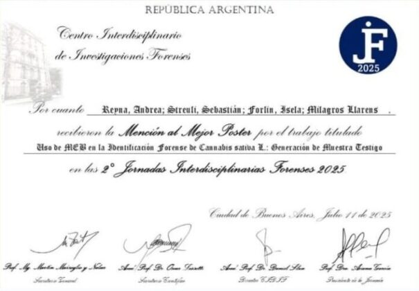 Durante la 2ª Jornada Interdisciplinaria Forense 2025, se reconoció un proyecto del Instituto de Ciencias Criminalísticas y Criminología de la UNNE con la Mención al Mejor Póster. Esta investigación, que se basa en la tecnología de Microscopía Electrónica de Barrido (MEB) y pruebas químicas, ha permitido la creación de una «muestra testigo» de Cannabis sativa L. para su uso como estándar de referencia en el análisis comparativo con otras plantas secuestradas en operativos de seguridad.