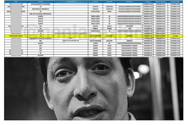 El que autorizó esa entrada, a las 13.55, fue Santiago Caputo. De acuerdo al mismo documento, el rosarino se dirigió en esa oportunidad directamente a la dependencia “Asesores”.