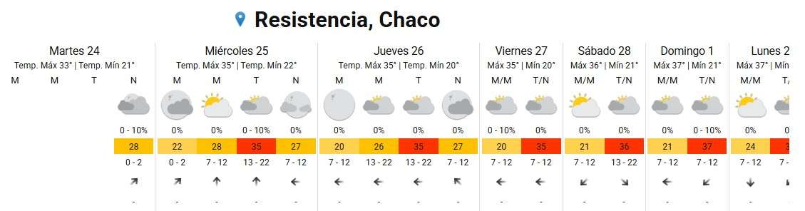 Miércoles 25: se espera una jornada con cielo parcialmente nublado por la mañana, tendiendo a mayormente nublado por la tarde. Los vientos serán leves del sector sur rotando al este, con una mínima de 22°C y una máxima de 35°C.