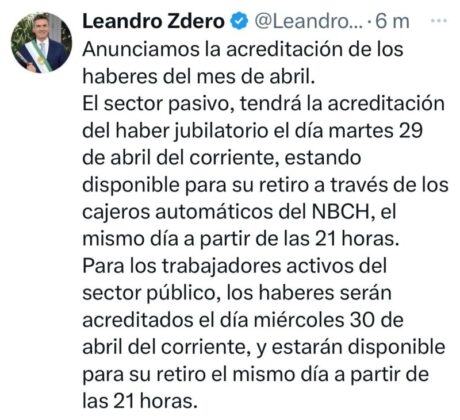 El gobernador Leandro Zdero informó este miércoles a través de su cuenta de X, las fechas de acreditación de haberes correspondientes al mes de abril para los trabajadores de la administración pública provincial, tanto activos como pasivos.