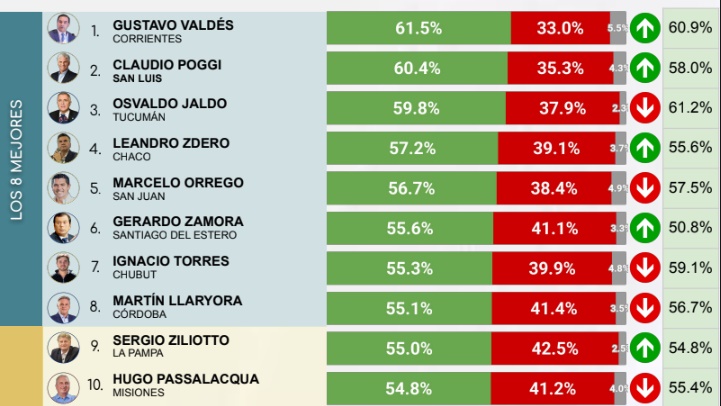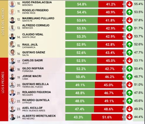 En el otro extremo del ranking, los gobernadores con menor imagen positiva fueron Axel Kicillof (Buenos Aires, 43,3%) y Alberto Weretilneck (Río Negro, 43%).